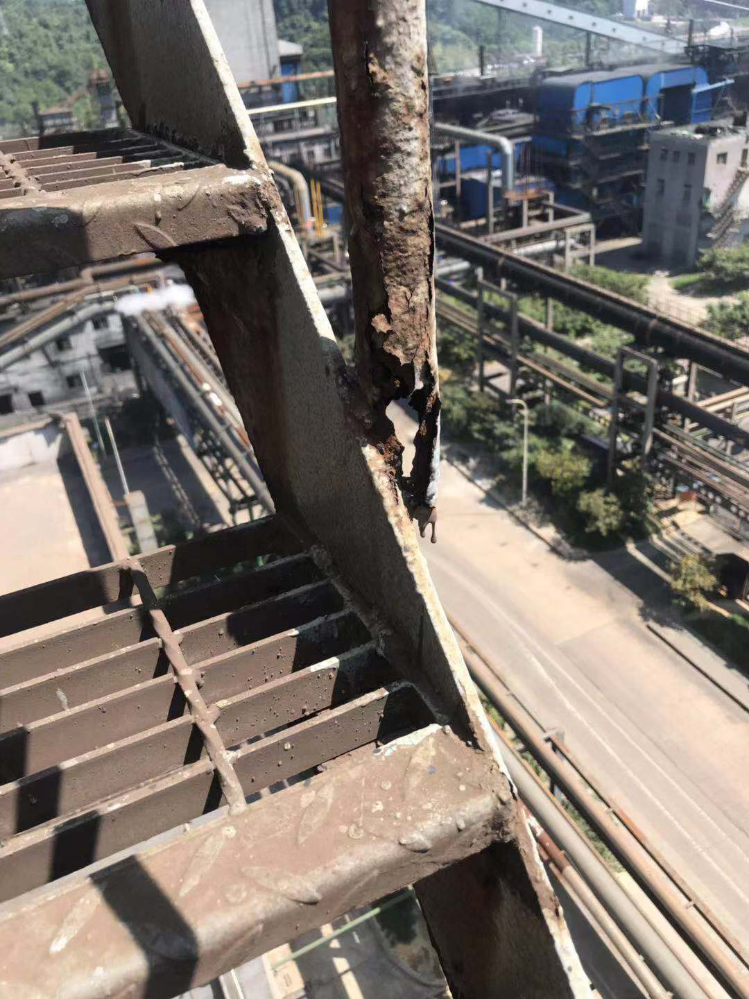 內江藍鼎自接手運維工作以來,在實際生產運行中發(fā)現(xiàn)了許多安全隱患,其中燒結1#2#脫硫塔上塔梯步腐蝕嚴重,人員上下塔存在嚴重安全隱患,為保障人員安全,生產部決定將1#2#脫硫塔上塔梯步平臺進行全面修復更換,拆除嚴重腐蝕的護欄、平臺,安裝新護欄、平臺。