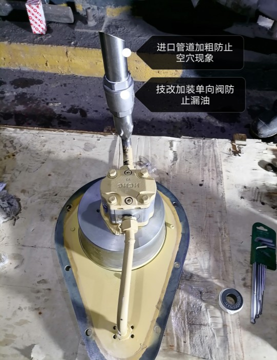 9月3日晚上8點天空下著大雨,2號燒結(jié)機(jī)正常槽滿停機(jī),2號脫硫脫硝系統(tǒng)同步停機(jī)檢修,由于疫情期間靜態(tài)管理,檢修班組上班人員只有11人,每天工作強(qiáng)度大,在人困馬乏的情況下,檢修班組冒著大雨開始拆除2期風(fēng)機(jī)液壓油泵,在拆解后發(fā)現(xiàn)油泵的進(jìn)油管偏小,并且無止回閥。檢修班組立即將進(jìn)油管切斷加裝了一個單向閥和將進(jìn)油管更換為大一型號的管子。當(dāng)日23:30分現(xiàn)場試驗油泵能正常將油抽出。檢修班將技改后的油泵停運(yùn)至9月5日11點,再次啟動油泵,油泵運(yùn)行正常,技改成功。